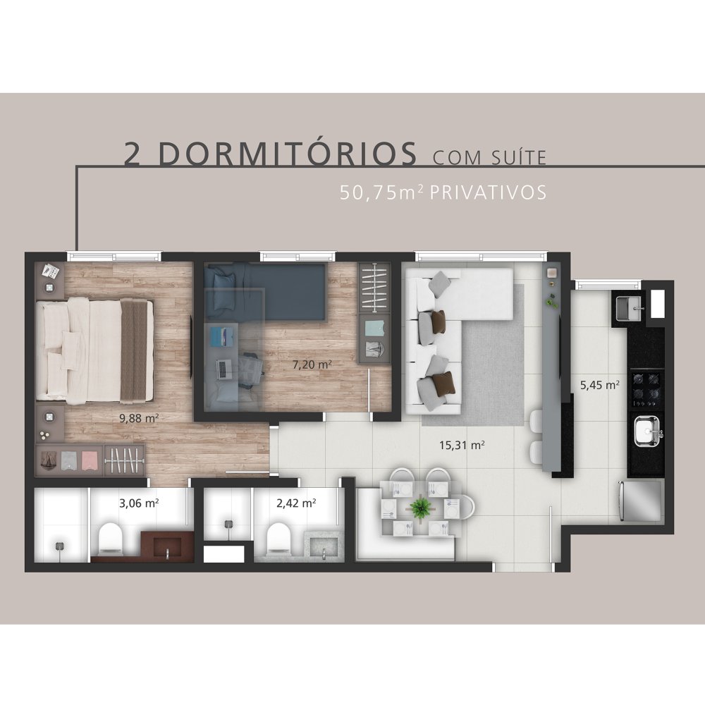 2 DORMS.COM SUÍTE E CHURRASQUEIRA 50,75M 2 PRIVATIVOS
