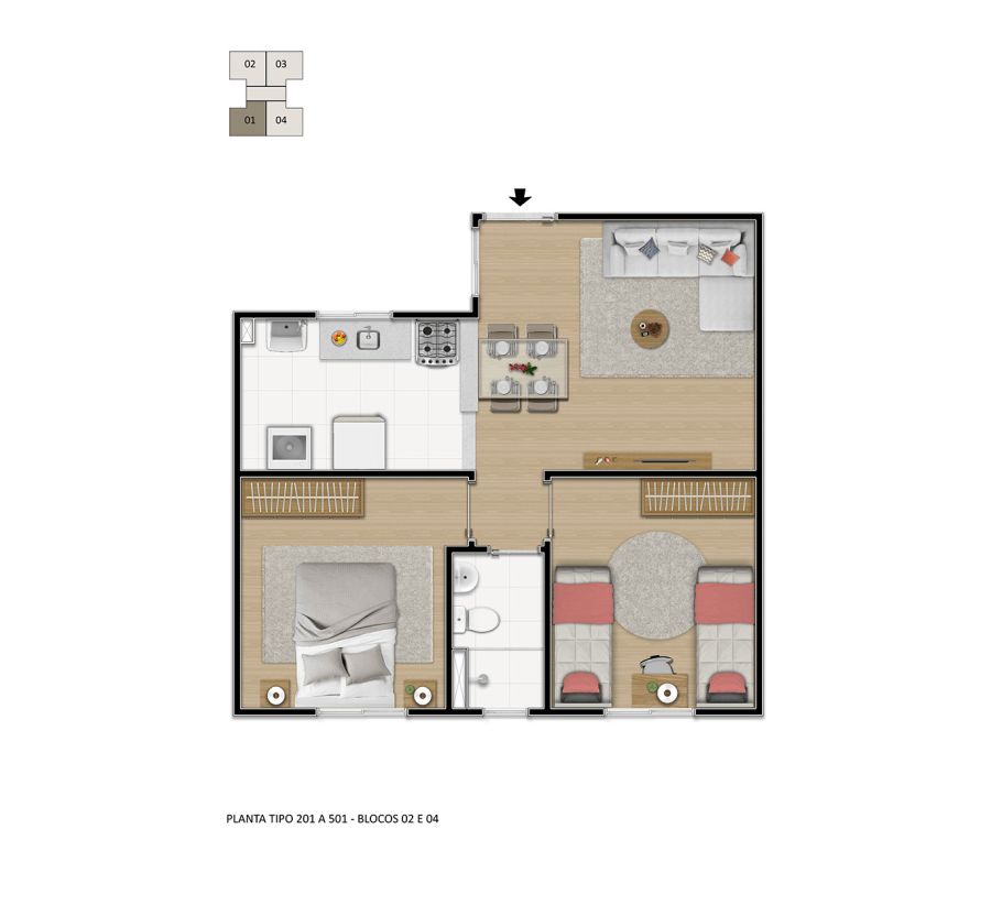 Desfrute de uma área privativa de 42m² inteligentemente distribuídos em: