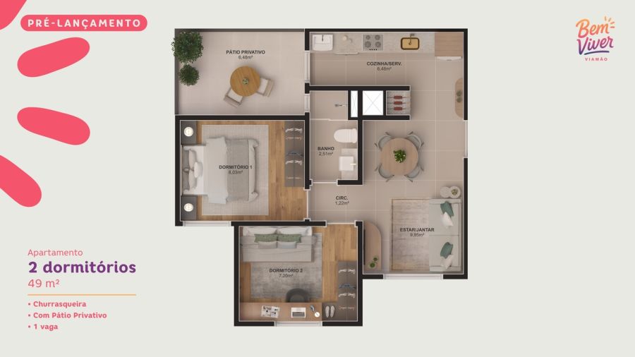 Apartamentos de 2 dormitórios (plantas de 42m² a 49m²), com churrasqueira e opção de Garden privativo (conforme unidade).Plantas funcionais, ambientes bem distribuídos e um condomínio pensado para uma vida leve, segura e acolhedora.