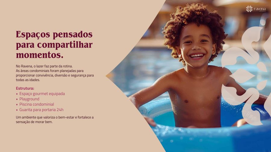 Área condominial com playground, piscina refrescante e espaço gourmet equipado;